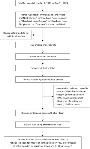 A literature search was conducted using PubMed to identify primary studies published between January 1, 1990, and December 31, 2024 that reported original data on cannabis use in the context of HNC. As this is a narrative review, we limited our search to the PubMed database, which provides broad coverage of relevant biomedical literature. 1990 was selected as the lower cutoff, as this is when the first case reports regarding a potential association between cannabis use and HNC were published (20,21). The search strategy incorporated the following combination of search terms: “Cannabis” or “Marijuana” and “Head and Neck Cancer” or “Head and Neck Cancer Survivor” or “Head and Neck Cancer Surgery”. Each combination of search terms was utilized (six in total), and all studies meeting inclusion criteria were included. Additionally, the authors reviewed the reference lists of retrieved articles to identify additional eligible studies. If the initial literature search revealed information about cannabis use among non-HNC survivors that addressed gaps in HNC-related literature, those manuscripts were included to enhance the narrative discussion. No restrictions were imposed on the search concerning publication country or sample size.